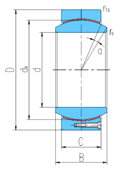 产品特点:外圈径向分为两半,用螺钉锁紧,材料为碳钢,磷化,球面粘贴PTFE编织物;内圈材料为轴承钢,淬火,球面镀硬铬。
