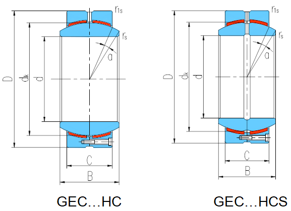 产品特点:外圈径向分为两半,用螺钉锁紧,材料为碳钢,磷化,球面衬有PTFE复合材料;内圈材料为轴承钢,淬火,球面镀硬铬,型号后置代号加S,表示内圈有润滑油槽油孔。
