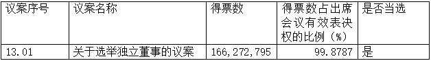 本次股东大会审议的议案十三采用累积投票制,此议案的表决结果仅统计列示表决同意股数及比例。