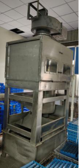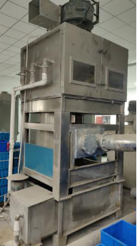 5)设备的水除尘采用专用水喷淋除尘设备。整体应采用不锈钢制造,含支架、外壳及内部过滤网。空气由下部通入,上部出气(下行的水管应深入水箱底部,再让水流溢流至过滤网,必要时增加引风机,确保含尘气体上逸。);底部设有水池,配有浮标,池中的水可自动补充,水池底部配有排污装置,可将粉尘等沉淀物排出;系统配有独立开关,可控制除尘的启停;箱内过滤的滤网采用不锈钢滤网并在隔层内加装吸尘小球,喷水阀采用消防喷水头。具体样式参照我司现有水除尘设备样式,如下图: