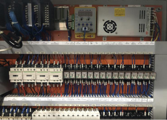 所有的电气元器件、电线都必须要求有唯一的标识,标识的内容要求和电气图纸资料中的标识相一致;电气元件标识位于电气元件正上方,除了标出与图纸一致的元件代号外,应标出终端负载(或控制下一层级)电气元件的中文名称,例如: