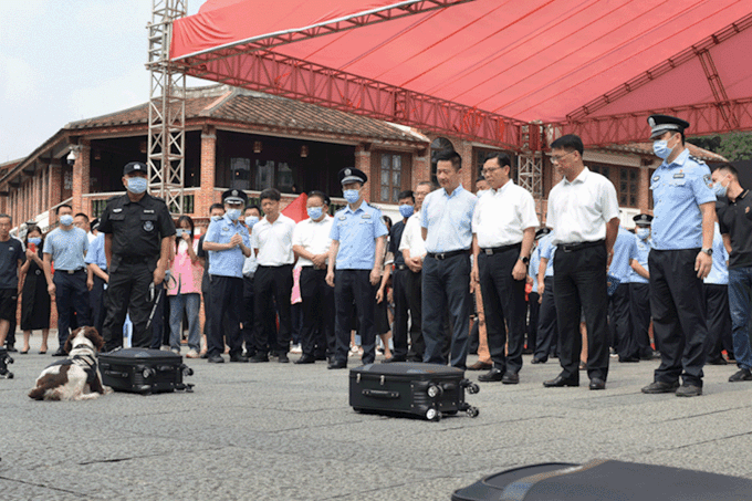 缉毒犬查缉表演区缉毒犬现场表演查缉快递中隐藏的毒品,展示了缉毒犬精准查毒技巧,贴近实战形式,吸引过往群众驻足观看。
