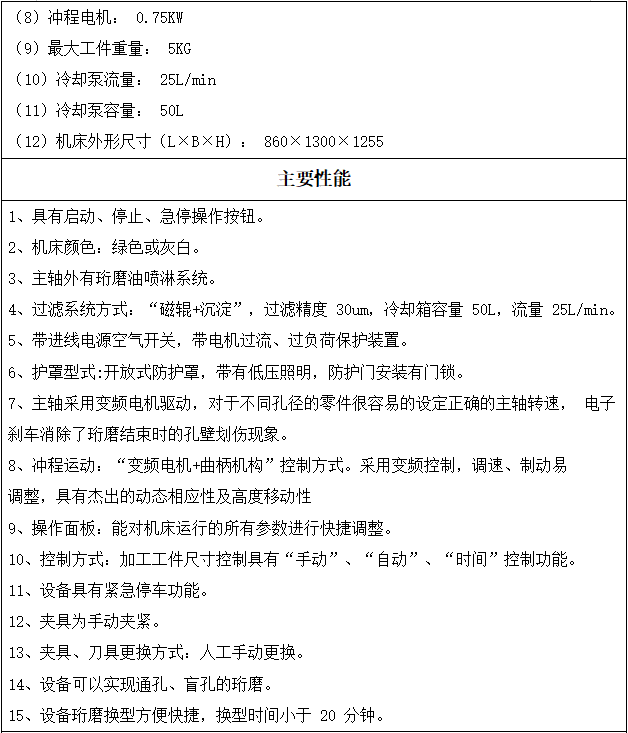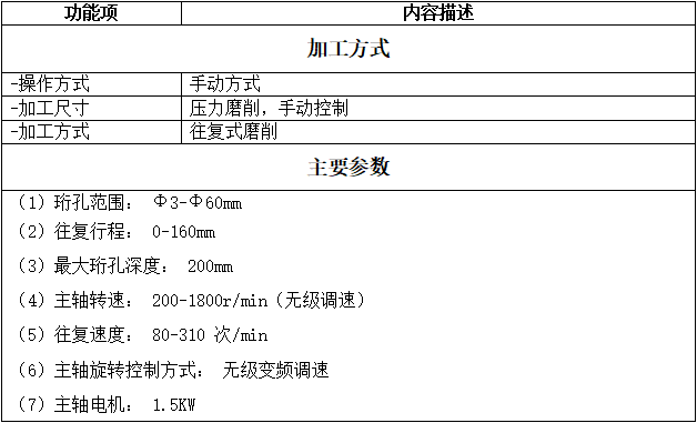 珩孔范围: Ф3-Ф60mm ;往复行程: 0-160mm ;最大珩孔深度: 200mm