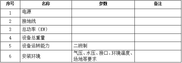 3.设备其他技术指标:(需含设备总功率、电压、电流、气压、水压、接口、环境温度、场地等安装环境有关要求)