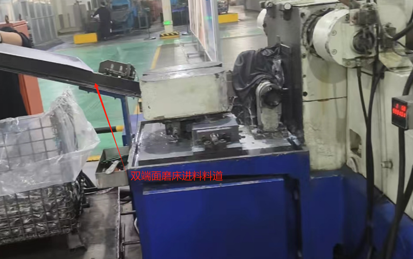 (来料)料篮整框上料→双端面磨床进料槽→磨削→双端面磨床出料槽→计数→分料 →进出料箱