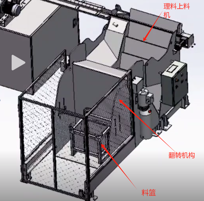 1.1上料:实现整篮上料,翻转机构将料篮翻转,物料间歇式倒入理料机(料篮翻转角度可控),理料机自动理料,有序送料至双端面磨床进料料道。