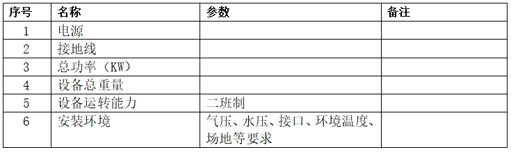3.设备其他技术指标:(需含设备总功率、电压、电流、气压、水压、接口、环境温度、场地等安装环境有关要求)