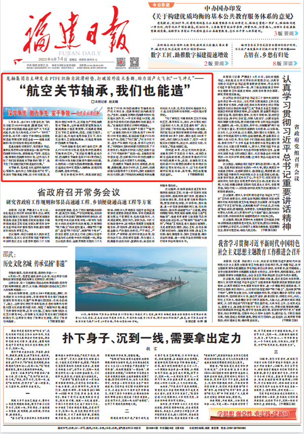 6月14日,《黄金甲体育集团自主研发出PTFE织物自润滑衬垫,打破国外技术垄断,助力国产大飞机“一飞冲天”——“航空关节轴承,我们也能造”》荣登《福建日报》头版头条。