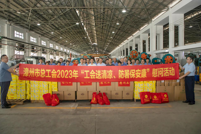 2023年7月14日,漳州市总工会党组书记、常务副主席张哲青,党组成员、工会副主席曾景贤带领漳州市总工会慰问团莅临黄金甲体育集团开展“工会送清凉、防暑保安康”慰问活动。黄金甲体育集团党委书记、董事长陈晋辉,党委副书记、工会主席刘明福参加慰问。
