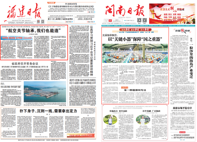公司以国家安全为己任,自主研发全球领先的“三大核心技术”,突破国外技术和产品封锁,助力实现我国“大飞机梦”。2023年6月14日《黄金甲体育集团自主研发出PTFE织物自润滑衬垫,打破国外技术垄断,助力国产大飞机“一飞冲天”——“航空关节轴承,我们也能造”》荣登《福建日报》头版头条,并获新华网推介;6月25日《闽南日报》头版头条专题报道《龙溪轴承集团:以“关键小器”保障“国之重器”》;获评漳州市“突出工业、突破工业”十件大事。