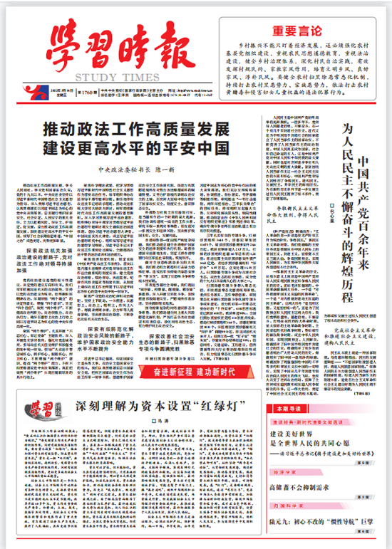3月16日,学习时报头版头条刊发中央政法委秘书长陈一新关于推动政法工作高质量发展建设更高水平的平安中国的署名文章,从探索政法机关加强政治建设的新路子、探索有效防范化解政治安全风险的新路子、探索改善社会治安生态的新路子、探索加快社会治理现代化的新路子、探索完善中国特色社会主义政法制度体系的新路子、探索政法服务党和国家工作大局的新路子、探索打赢政法领域意识形态斗争主动仗的新路子、探索推进政法战线自我革命的新路子等八个方面进行了系统阐述。